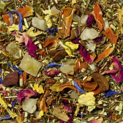 | Ingrediënten | groene - rooibos thee, mango stukjes (mango, suiker, citroenzuur (acidifier)), wortel stukjes, mangosteen schillen, aroma, rozenblaadjes, zonnebloem bloemblaadjes, kombucha thee-extract, korenbloem bloemblaadjes |