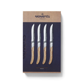 Artikelnummer: BD - TT11.002 / 6 Zie totale AssortimentDeze set van vier Moments steakmessen is gesmeed uit één stuk roestvrij staal, voor perfecte balans en kracht. Het handvat van olijfhout ligt stevig in de hand en geeft elke tafel een stijlvolle uitstraling. Het mes snijdt moeiteloos door ieder stuk vlees. Ideaal voor een verfijnd diner of smaakvolle barbecue.