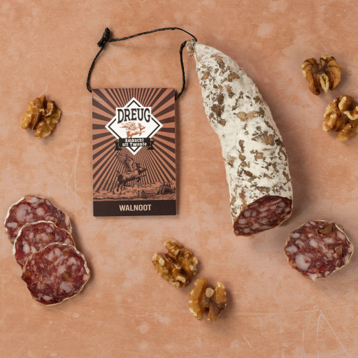 | Ingrediënten | Varkensvlees (83%),WALNOOT (10%), zout, dextrose, kruiden, specerijen, startercultuur, conserveermiddel: natriumnitriet, varkensdarm |