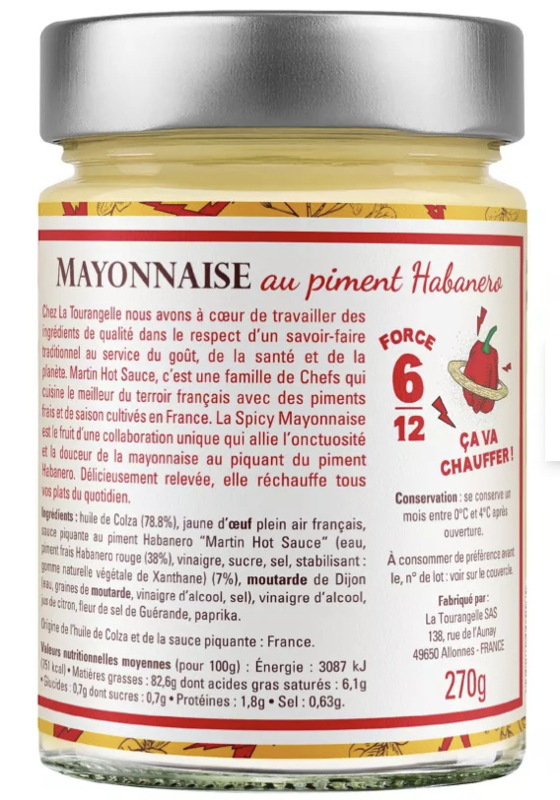 | Ingrediënten | Koolzaadolie (75%), Franse vrije-uitloopeidooier (9,6%), habaneropeper “Martin Hot Sauce” (38%), azijn, suiker, zout, stabilisator: natuurlijk xanthaangom (7%), Dijonmosterd, alcoholazijn, citroensap, zeezout uit Guérande, paprika. |