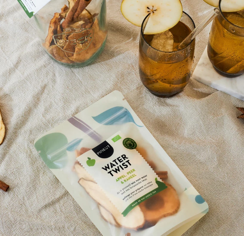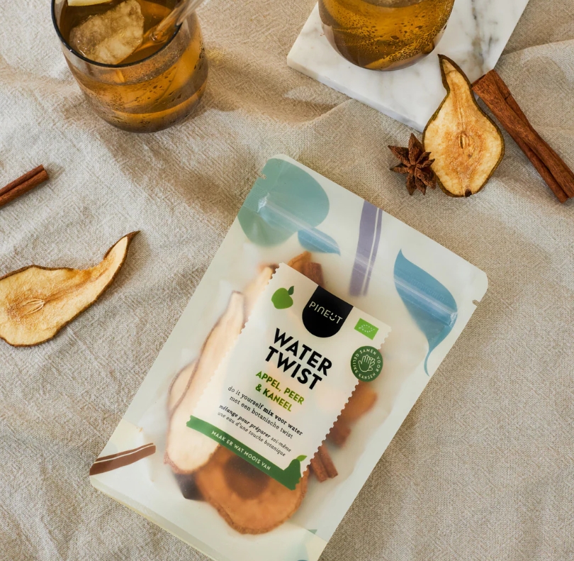 Artikelnummer: V - 4980 / 1 / 10 Zie totale AssortimentAppel en kaneel. Of toch peer en kaneel. Twee mooie combinaties. Pineut heeft een Water Twist gemaakt met alle drie. Inhoud 40 gram. Deze pouchebag is goed voor 10 liter tafelwater. Na bereiding wel binnen 24 uur consumeren.