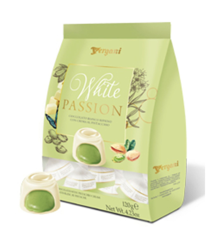 Vergani Passion Line Witte Chocolade met Pistache cream zakWitte chocolade pralines met pistache crème.