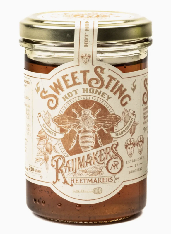 Raijmakers Heetmakers Gerookte Habanero Hot HoneySweet Sting is een gerookte habanero Hot Honey. Deze unieke honing combineert echte Europese honing met pittige, gerookte habaneropepers voor een gedurfde zoet-pittige kick.