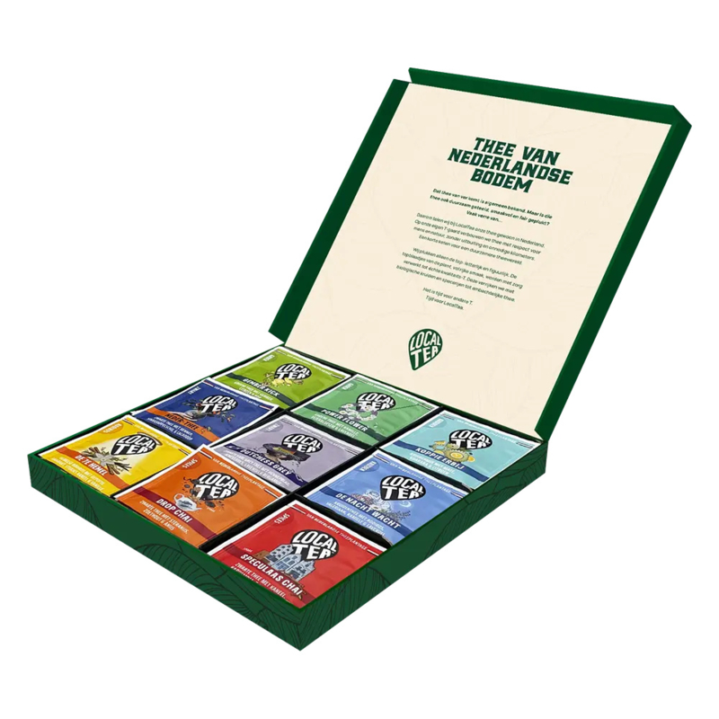 Local Tea Cadeaubox Thee 9 smaken (45 zakjes)Wat is thee met een hoofdletter T? Die teel je lokaal en verwerk je ambachtelijk. Je stopt er alle tijd en liefde in om de rijke T-smaken te ontwikkelen.