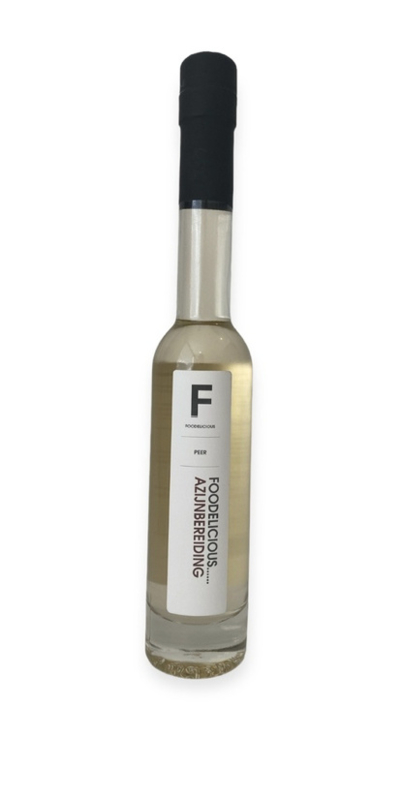 Foodelicous Peren AzijnFriszoete azijnbereiding met een lichtgele kleur. Heeft een aangename perensmaak en is lekker in salades met veldsla, tomaatjes, avocado, gerookte zalm of gegrilde kip.